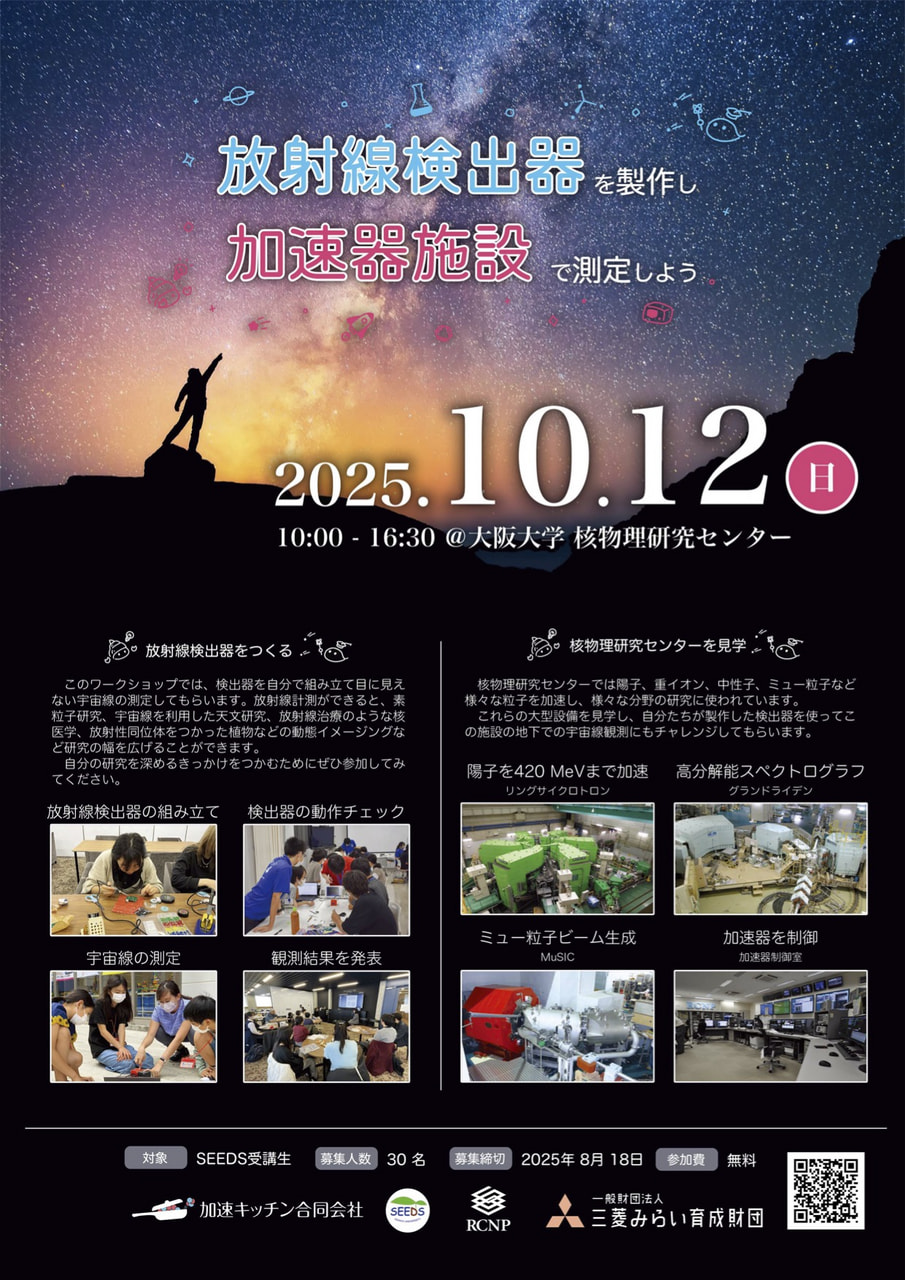 ・「加速キッチン」との共催で放射線検出ワークショップを開催しました。 核物理研究センター(RCNP)の協力を得て、加速キッチンとともにRCNPにて放射線検出ワークショップを開催。放射線検出器を自分たちで組み立て、それを用いた4種のテーマの放射線検出実験を行いました。また、RCNPの見学も行い、その後、実験結果についての発表・議論を行いました。ファーストステップ受講生34名が参加。