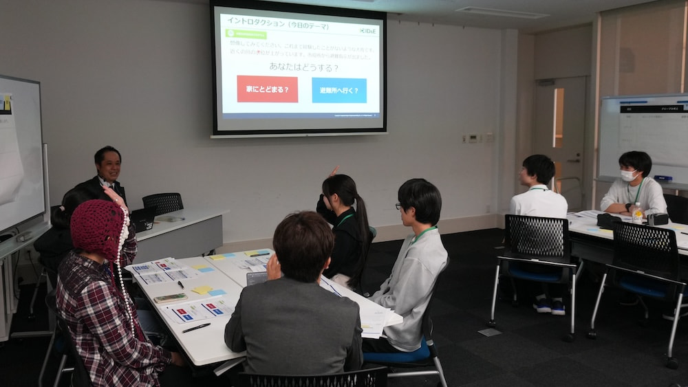 東京海上日動と日本工営のスタッフにお越しいただいて、東京海上グループのサステナビリティ活動に関するお話を伺った後、AR(拡張現実)を用いた臨場感あふれる水害のシミュレーションを体験し、その後、小グループに分かれて、家族構成などの設定に従い「垂直避難・水平避難のどちらで逃げるべきか?」というテーマでディスカッションとディベートを行いました。